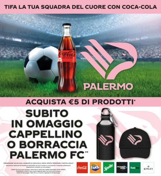 Dal 2 Ottobre al 22 Ottobre, puoi ricevere in omaggio un cappellino o una borraccia in alluminio del Palermo F.C. acquistando i prodotti Coca-Cola, Fanta, Sprite, Kinley, Powerade e Fuze…